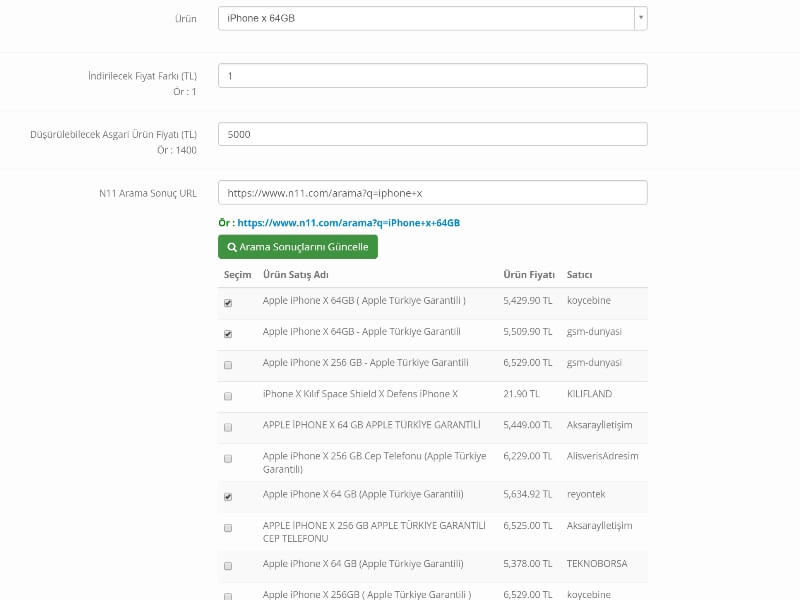 "Rakip Fiyat Analizi" modülü ile, ürünlerinizi fiyatlarını N11, GittiGidiyor ve HepsiBurada sitesindeki benzer ürünlerden günlük olarak kontrol ettirebilir, asgari fiyat tanımladığınız ürün fiyatının bu servislerdeki en uygun fiyata bağlı olarak belirlenmesini sağlayabilirsiniz. Eğer pazaryeri API kullanımınız varsa, fiyatı güncellenen ürün bilgileri anlık olarak ilgili pazar yerinde de (N11,GittiGidiyor ve HepsiBurada) güncellenecektir.