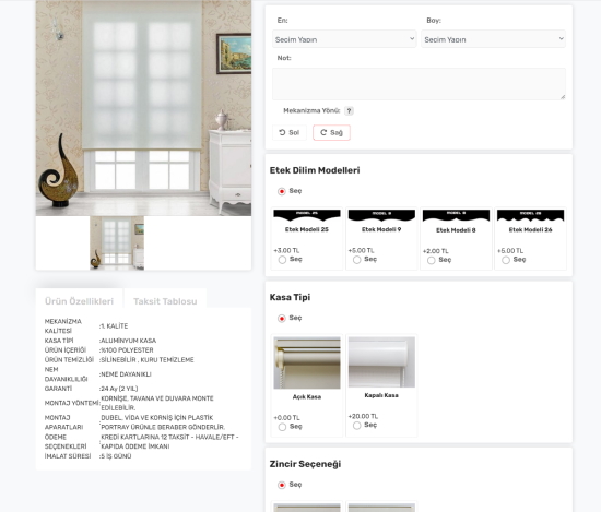 Ürün perde fiyatlandırma modülü ile perde siparişlerinizi en, boy dahil olmak üzere etek dilim tipi, kasa tipi, boncuk tipi benzeri detayları ile bilrikte farklı bütçelendirebilirsiniz.